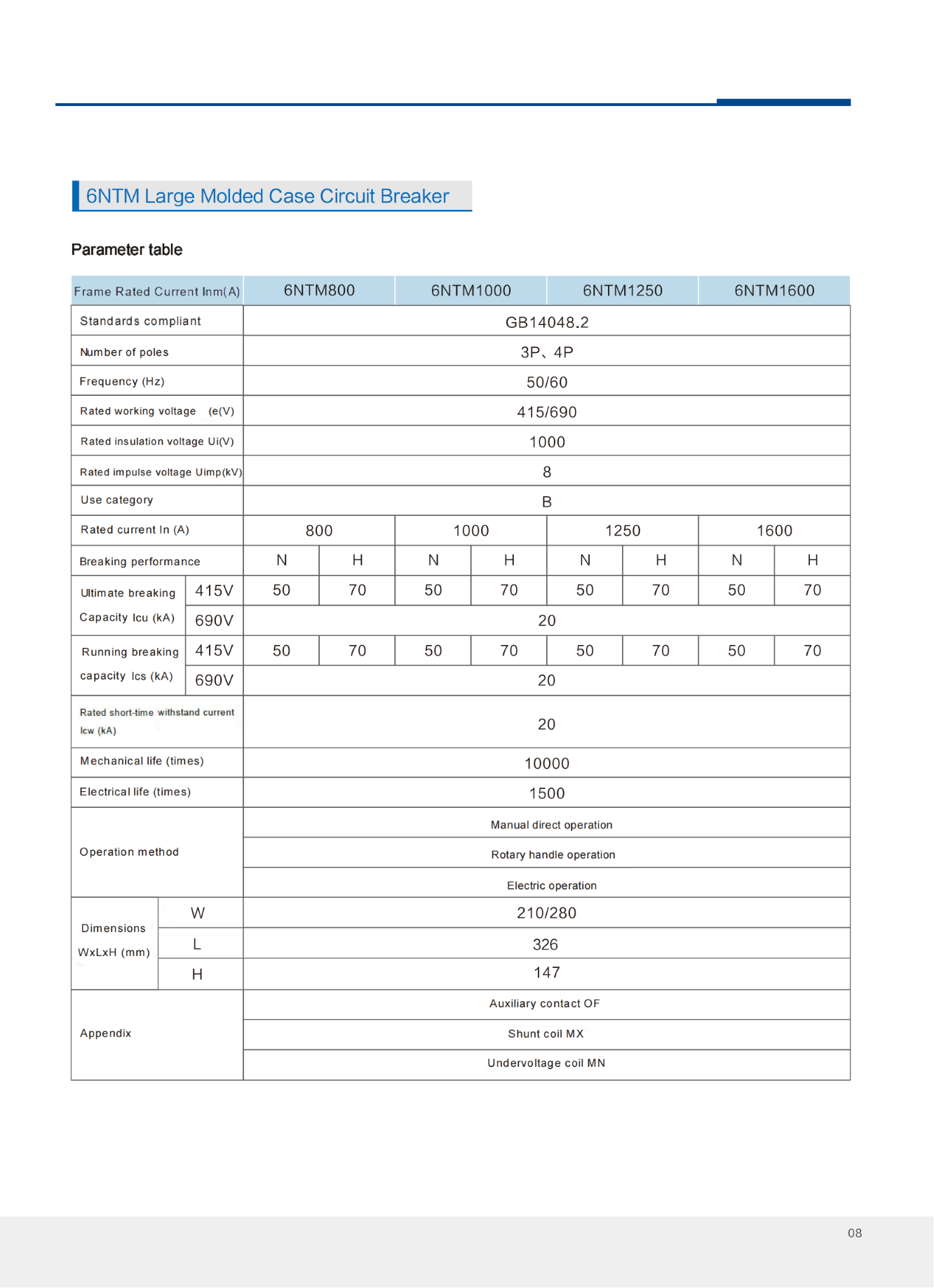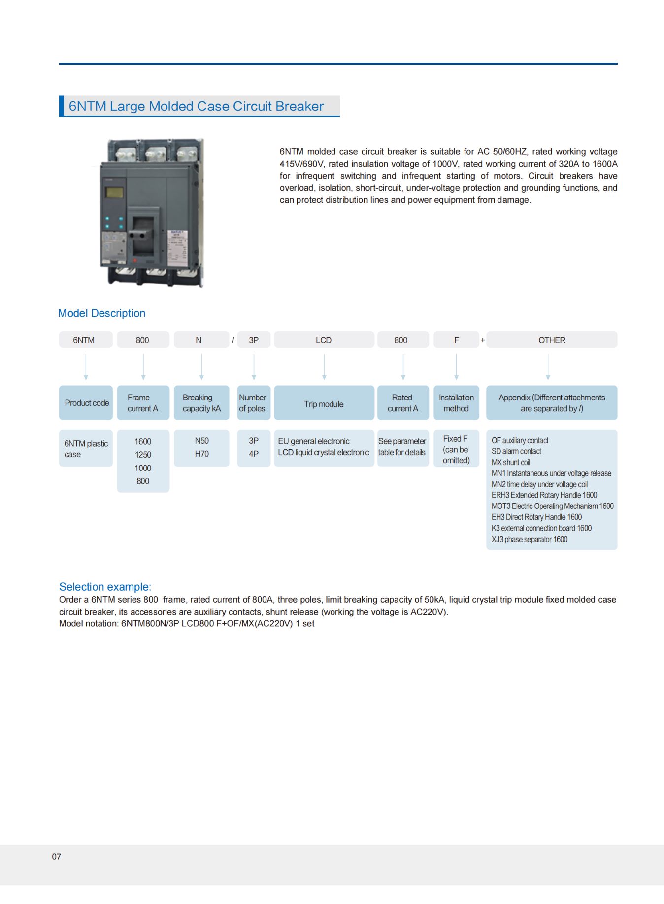 ●6NTM molded case circuit breaker is suitable for AC 50/60HZ, rated working voltage 415V/690V, rated insulation voltage of 1000V, rated working current of 320A to 1600A for infrequent switching and infrequent starting of motors. Circuit breakers have overload, isolation, short-circuit, under-voltage protection and grounding functions, and can protect distribution lines and power equipment from damage.